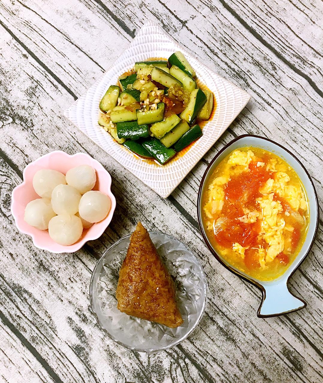 依然2001 做过 早餐•2018年5月28日 水果,拍黄瓜,蛋黄肉粽,番茄鸡蛋汤拍黄瓜用自己熬的油泼辣子和蒜蓉酱加上一点醋一点生抽拌一拌,好吃得不要不要的😋 #早餐•2018年5月28日##幸福的早餐时光# 2018-05-28