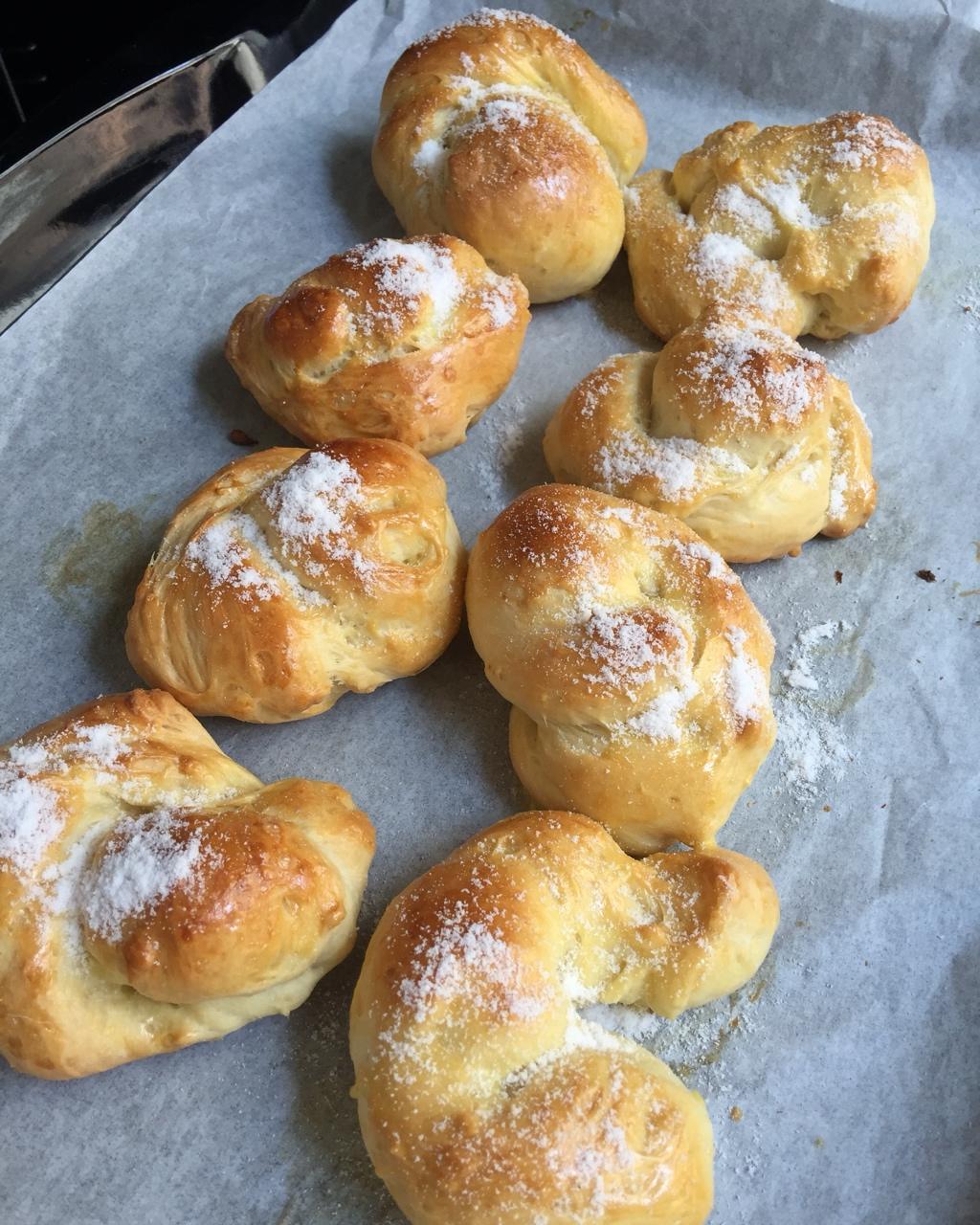 觉得糖不够,一点不甜,撒了糖粉好些。不知道为什么每次烤面包皮都好硬,没有一次成功的。