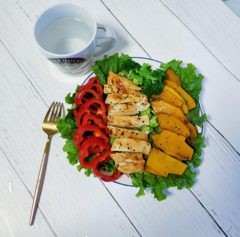 无油煎鸡胸肉+红椒+南瓜+西兰花