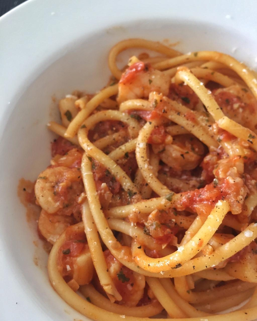 猫猫饼饼 做过 海鲜意大利面(目前最喜欢吃的) 没有新鲜叶子,就拿干欧芹碎代替啦加了一点甜椒粉没喝完的日本清酒多多的黑胡椒 还有现刨的帕玛森奶酪碎一键发送给不会做饭的意呆老直男! #午餐•2018年5月30日# 2018-05-30