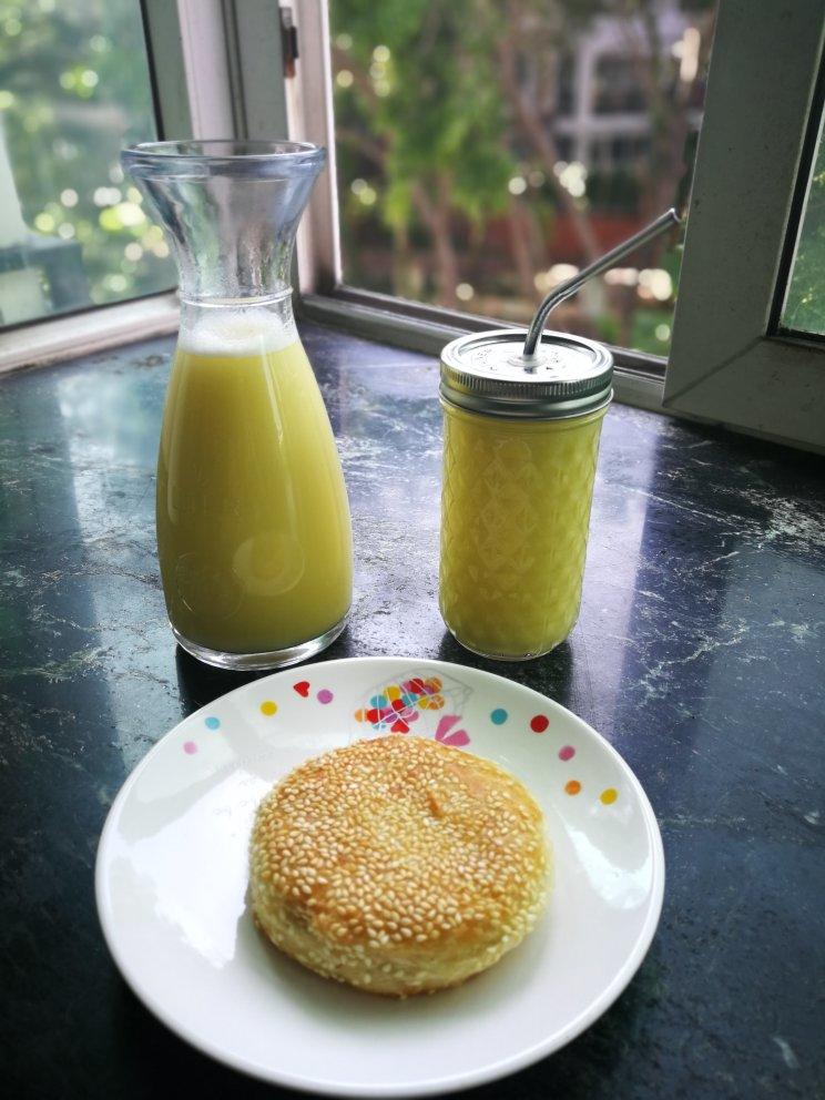 鲜玉米汁配油酥烧饼,被下厨房种草,无人破壁豆浆机太好用,自动清洗,榨的豆浆无渣。
