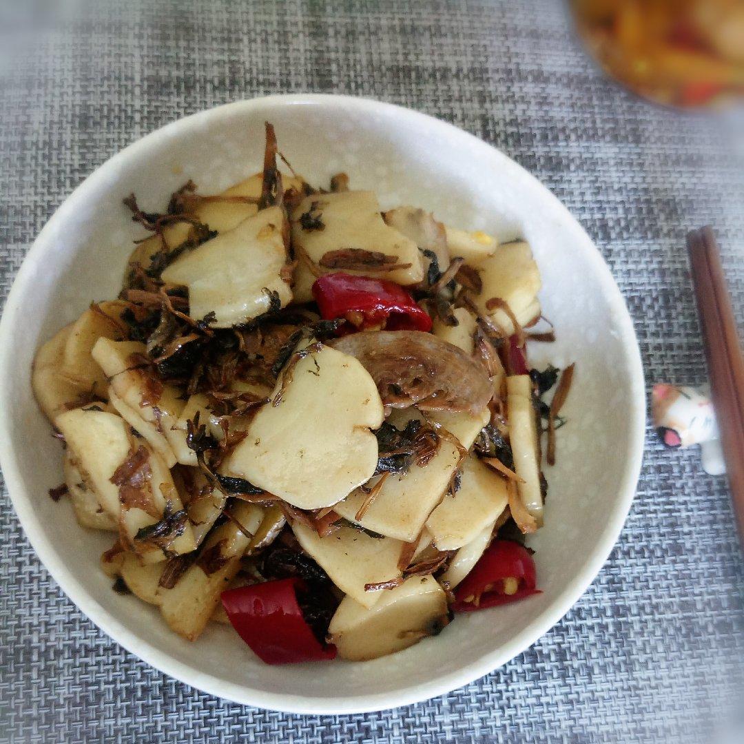 年糕与梅干菜完美的结合。油锅,下姜片,泡椒,炒香,下梅干菜,稍炒一会儿,下年糕片,炒匀,加少许水,生抽,盐,焖一会,翻炒片刻,出锅。