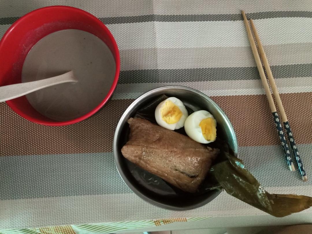 紫菜肉粽+水煮蛋还冲了一碗养生粉😂
