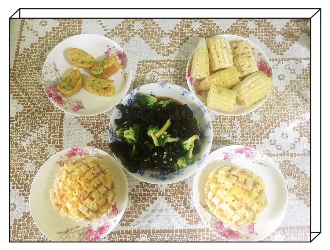 烤馒头,苦瓜鸡蛋,玉米,木耳西兰花!