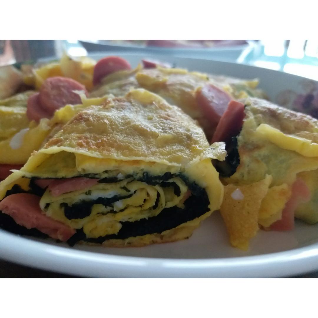 把菠菜改成海苔和火腿,无油无盐,味道偏淡。下次做番茄口味或黑椒口味