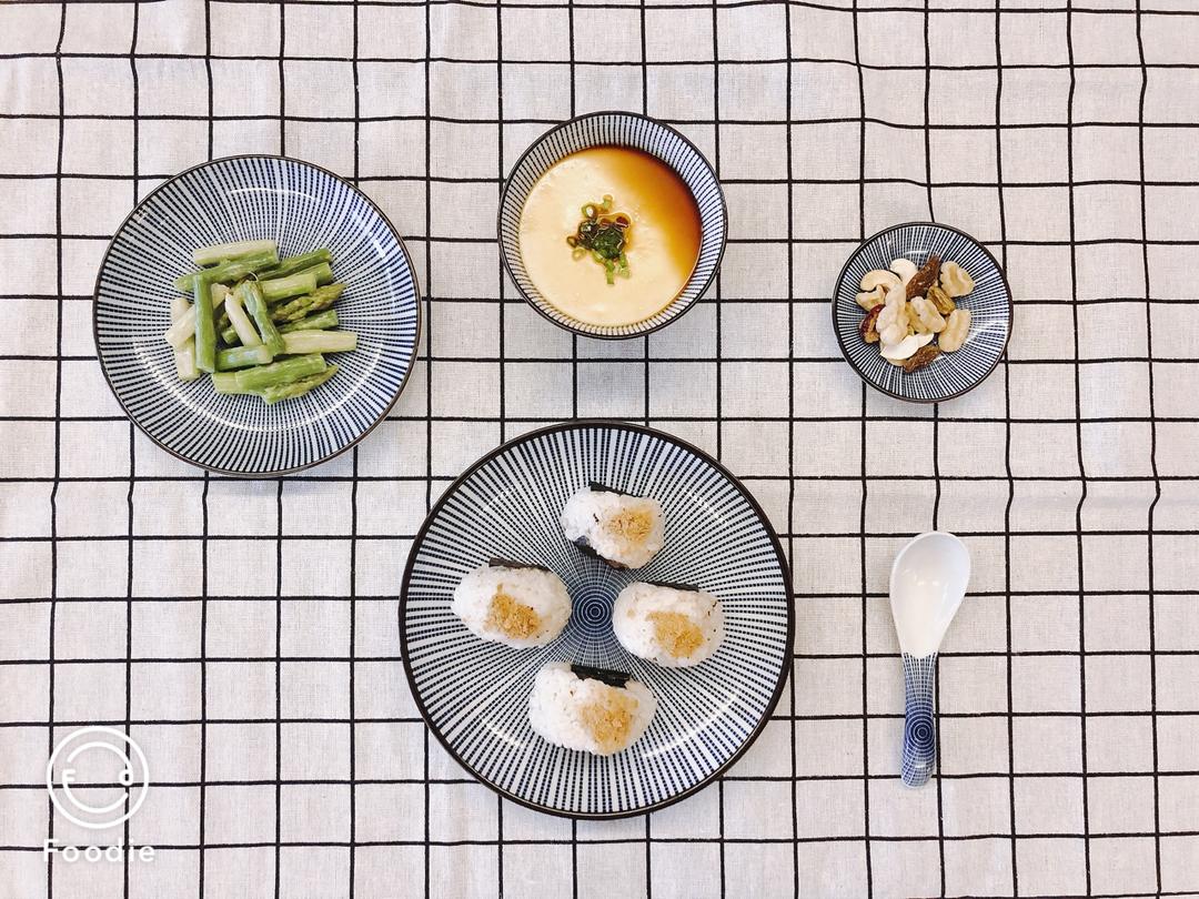 第一次尝试三角🍙,貌似还可以[愉快]干贝蒸水蛋,凉拌芦笋、坚果