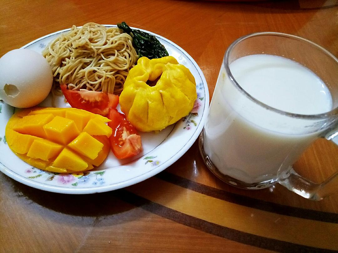 晨跑回来的营养早餐,乳清蛋白粉冲牛奶,干捞外海面,胡萝卜小包子,水煮蛋,西红柿,芒果 。