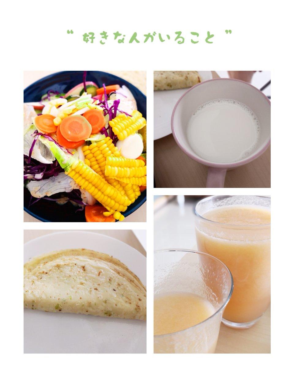蔬菜沙拉,鲜榨桃汁,蛋饼,牛奶,健康早餐🙃