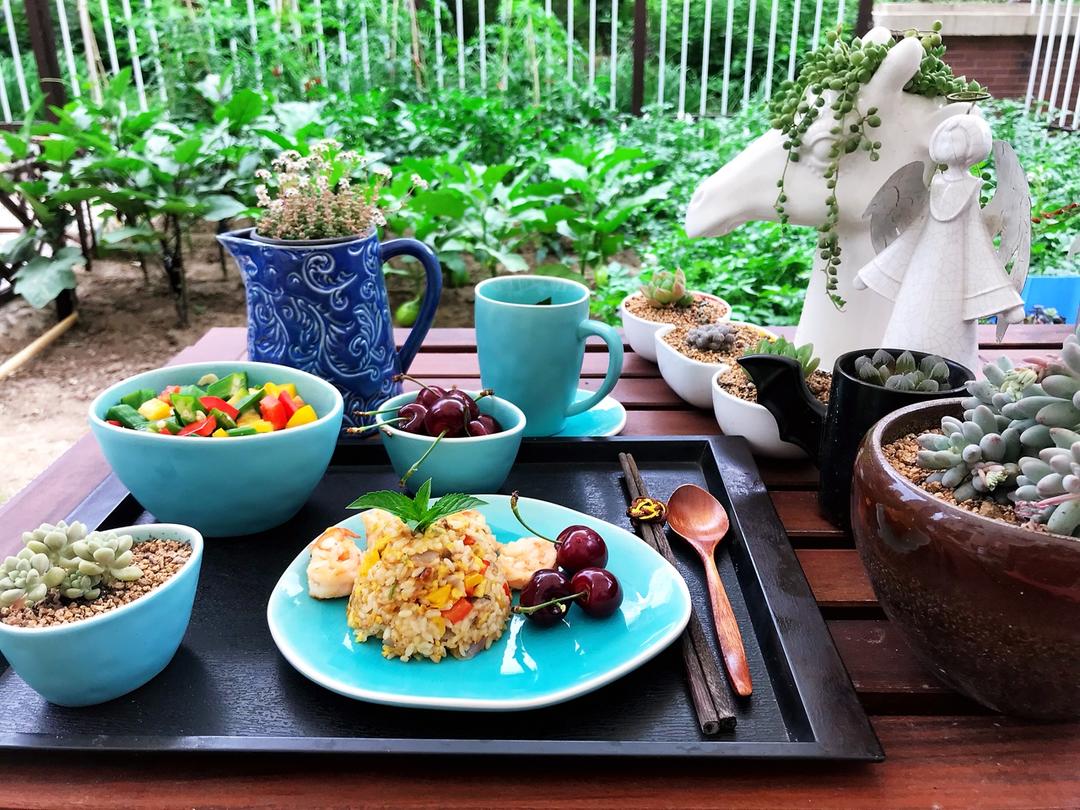 第一天,虾仁蛋炒饭、炝拌秋葵
