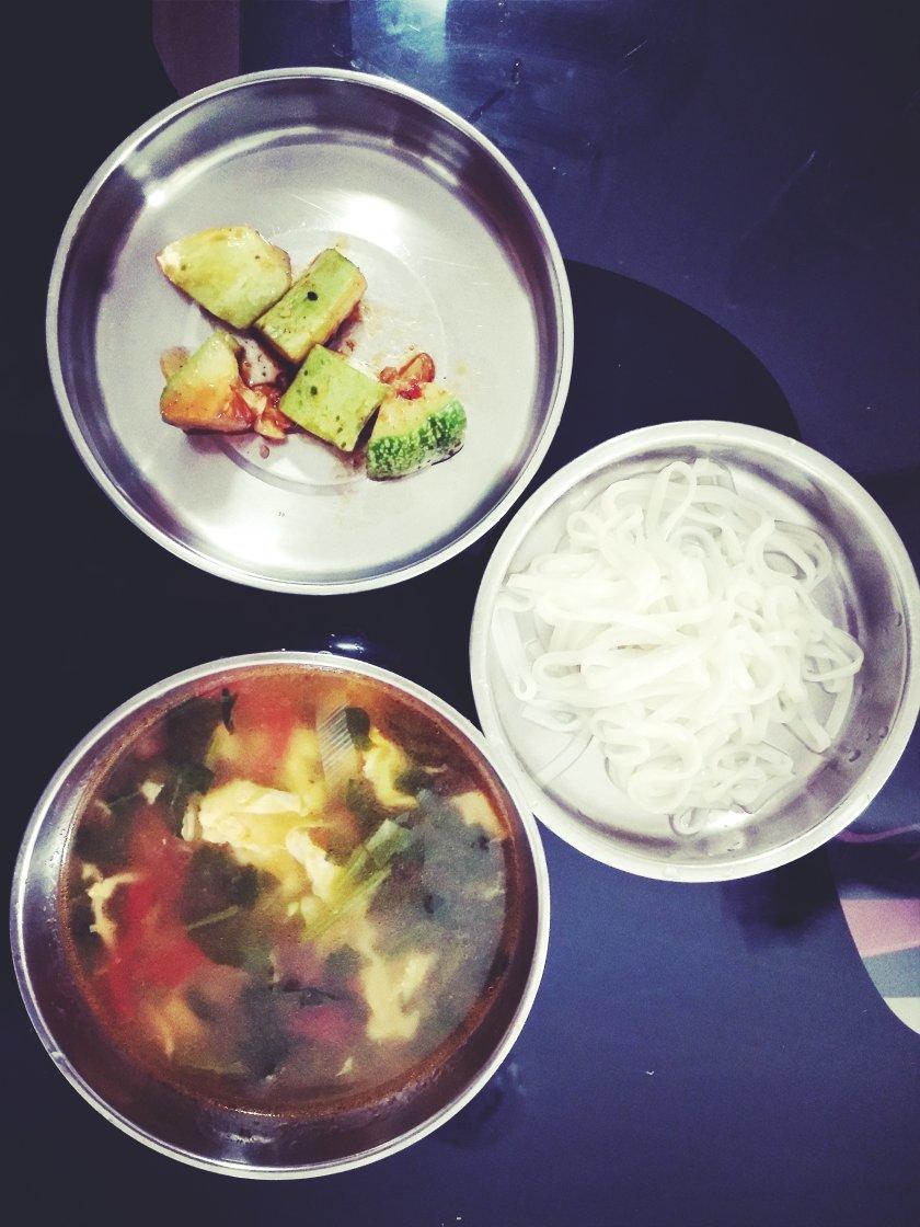 西红柿菠菜鸡蛋汤+清汤面,配邻居种的凉拌黄瓜