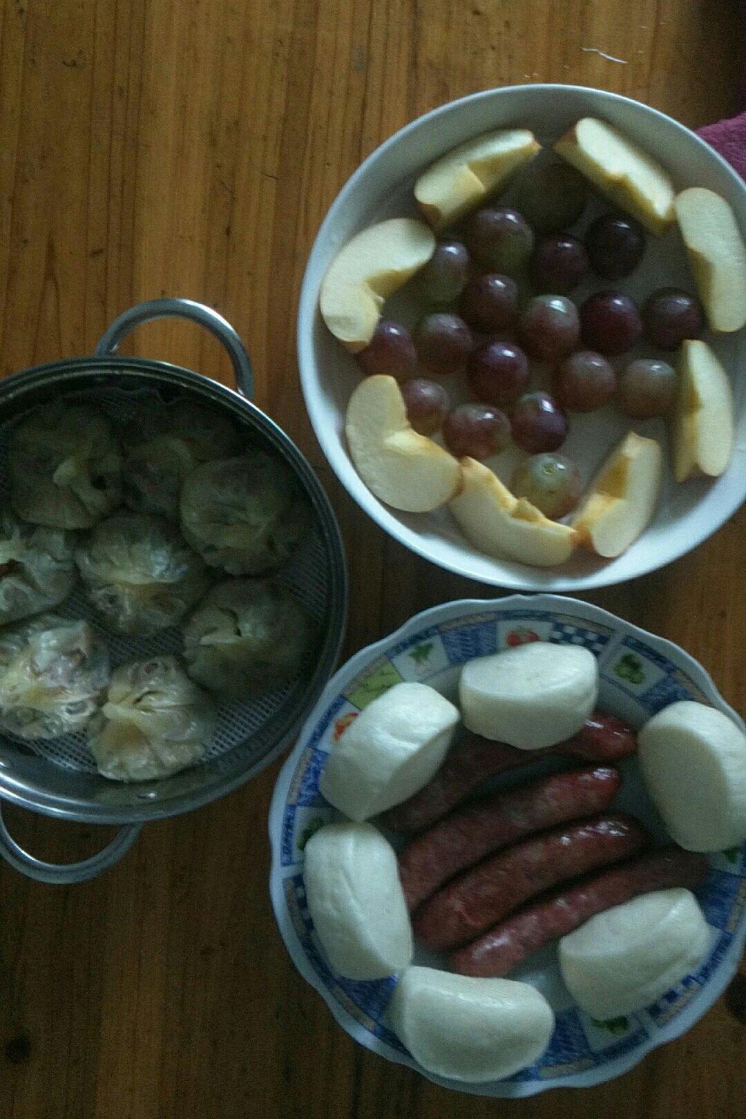 自己蒸的馒头烧麦,加上自己灌的台湾烤肠,一个苹果加点提子,我们娘仨竟然吃完了。