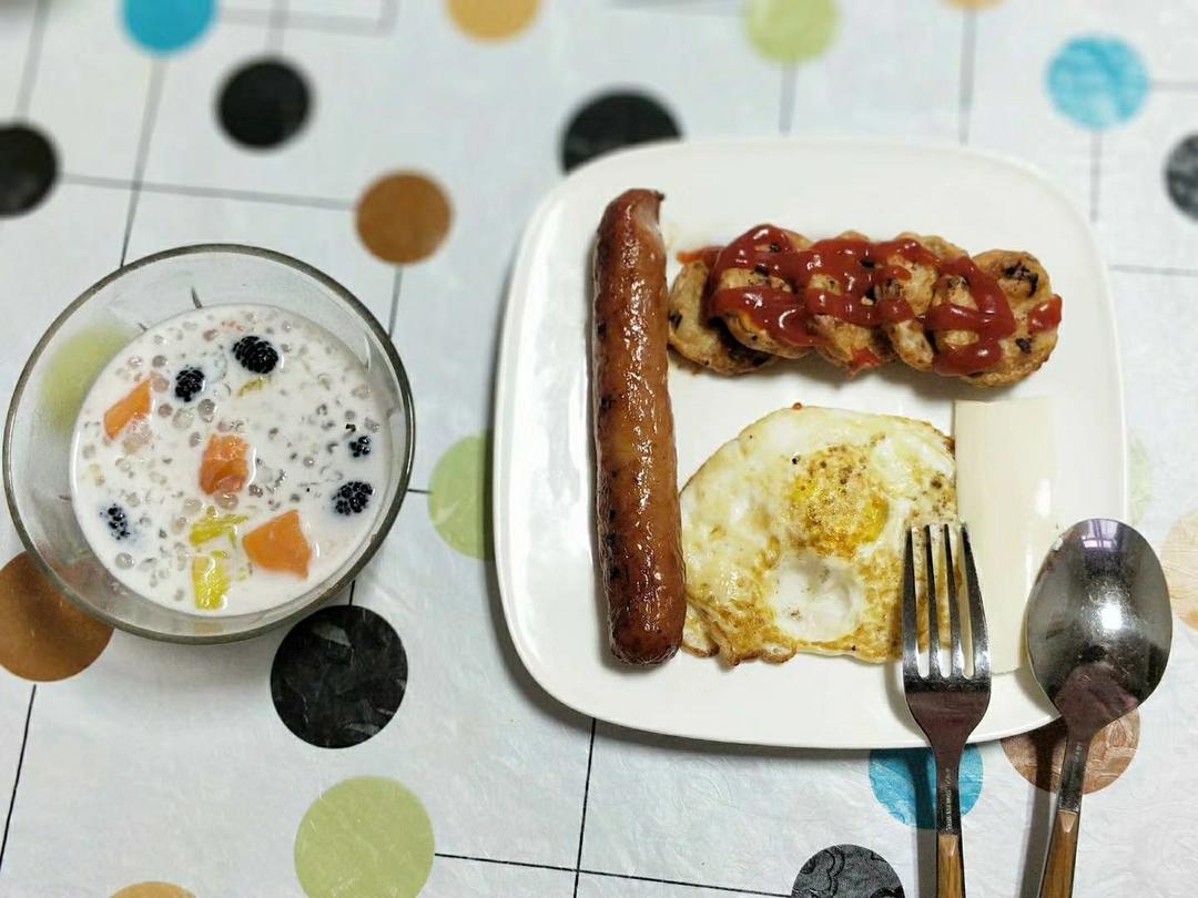 虾饼、煎蛋、香肠、西米露