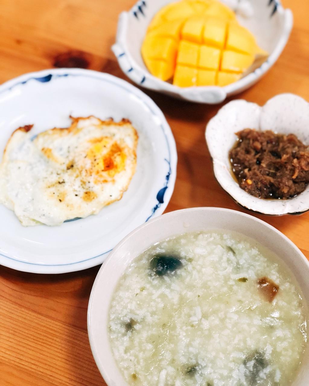 Day 3: 皮蛋粥、煎蛋、自制XO酱、芒果😋