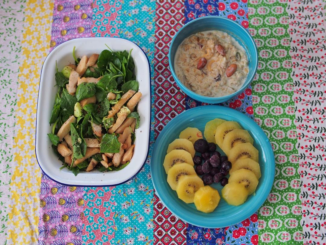 牛奶煮燕麦片➕坚果,鸡胸肉牛油果沙拉,水果