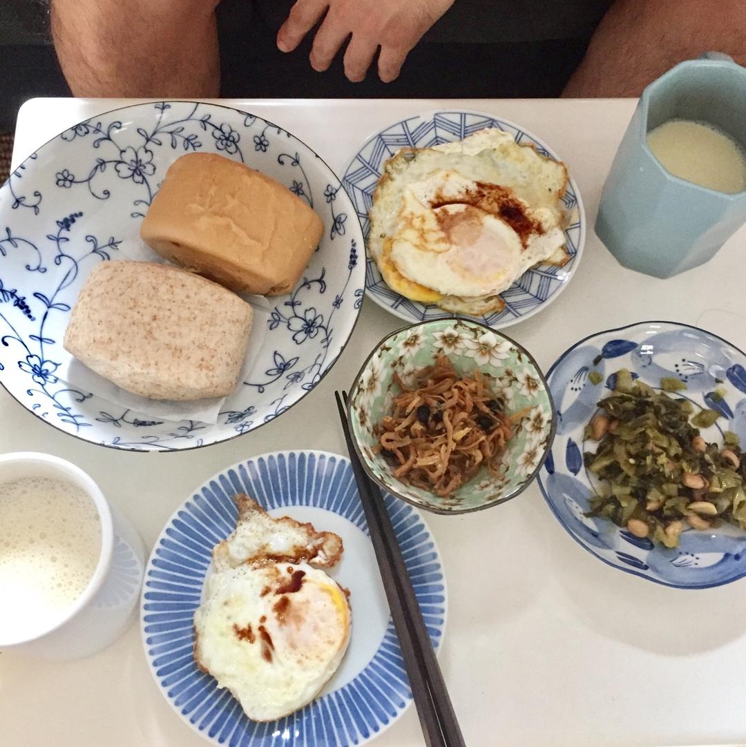 【2018.6.30第六天】梅菜花生、丁香鱼、煎蛋、馒头配自磨豆浆