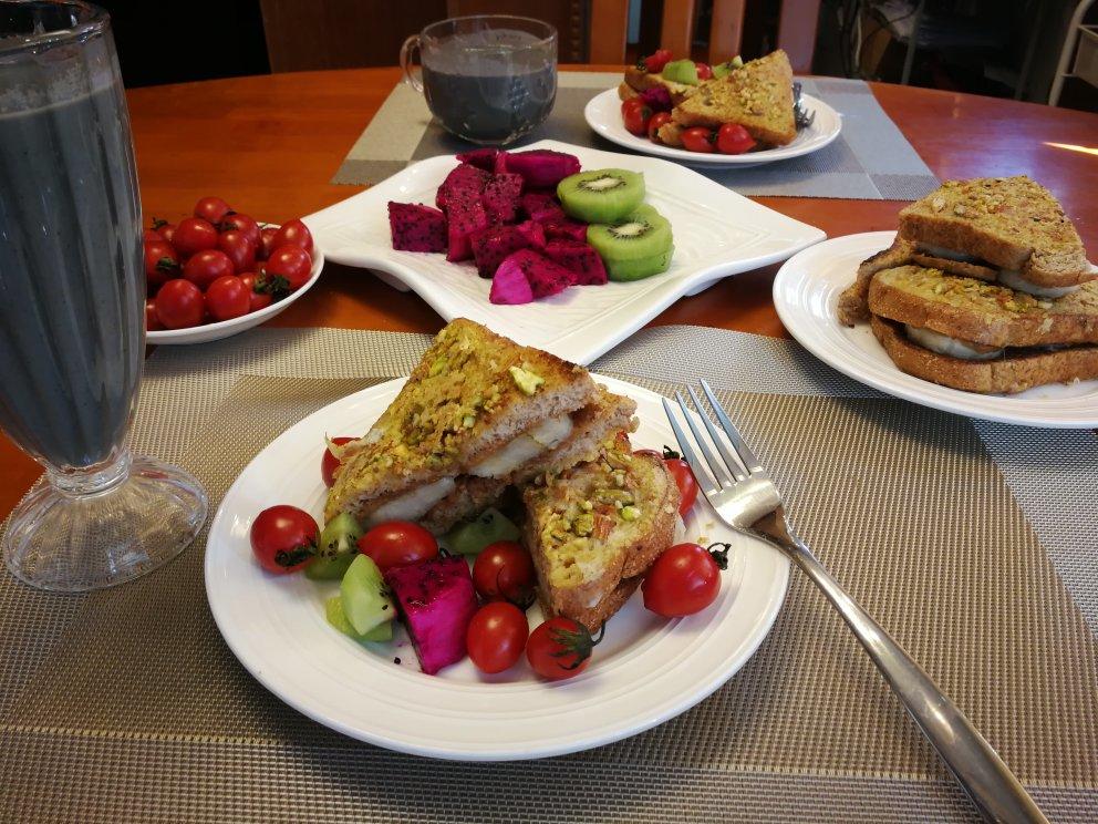 开心果杏仁脆夹香蕉法式吐司,配芝麻豆浆