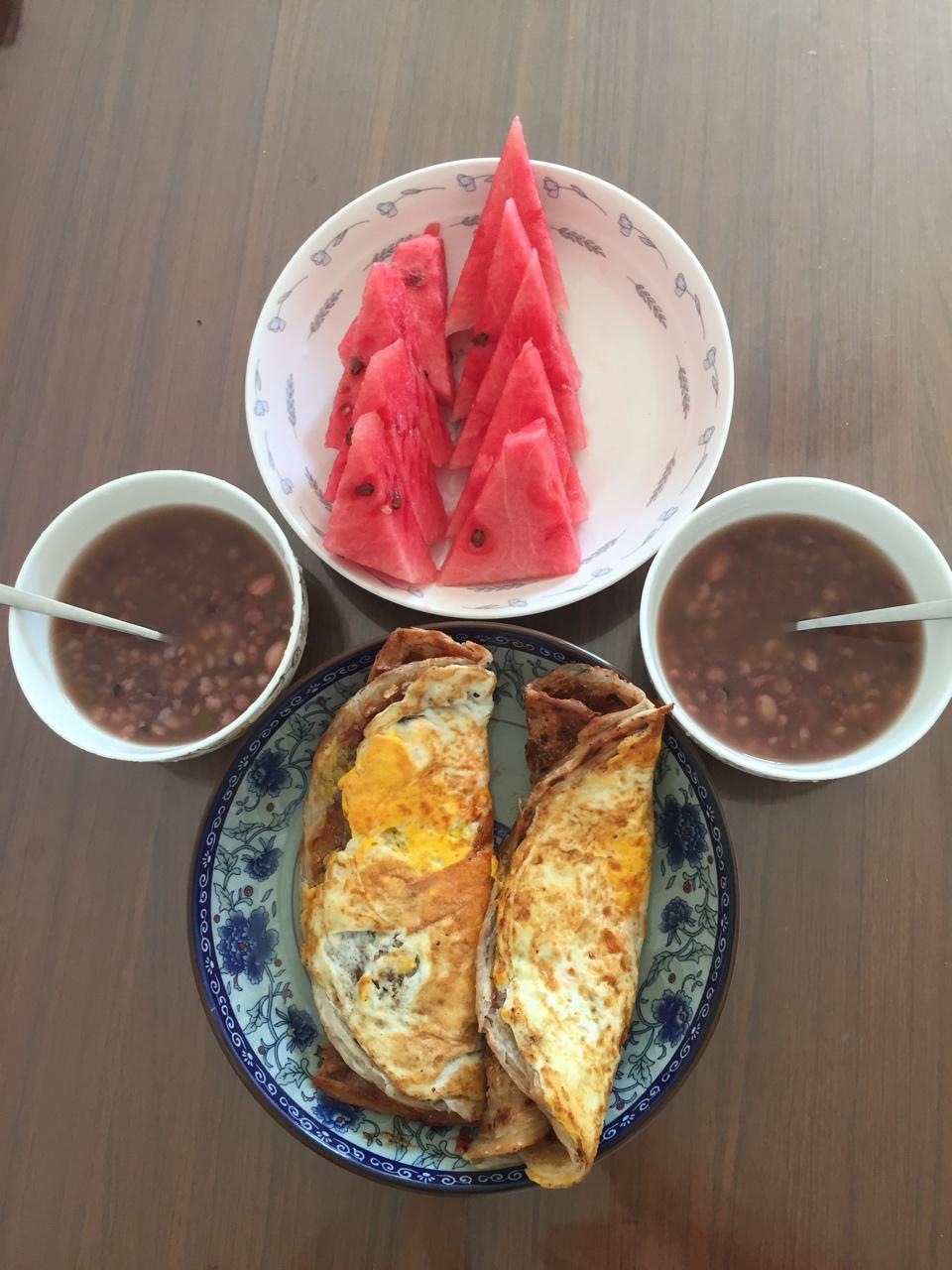 早餐打卡:八宝粥,手抓饼,西瓜