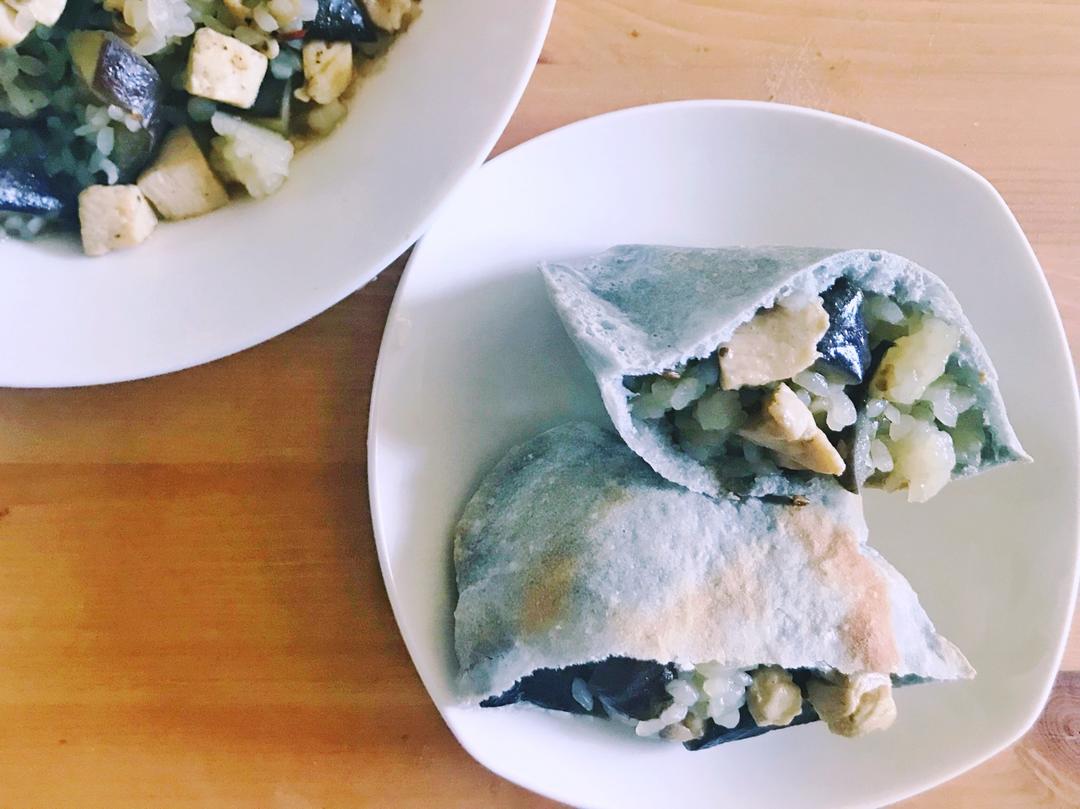 今天是花青素满满的一天( *`ω´)。蝶豆花皮塔饼配茄子鸡肉饭。