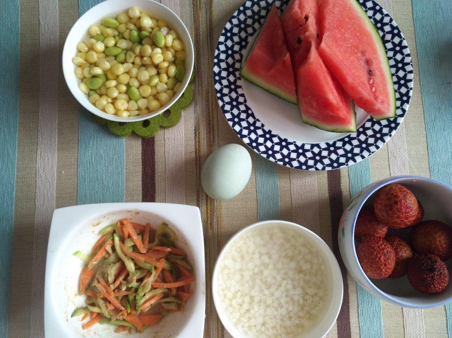 早餐分享:高粱米水饭,青豆煮玉米,麻酱胡萝卜丝拌黄瓜,咸鸭蛋,西瓜,荔枝。