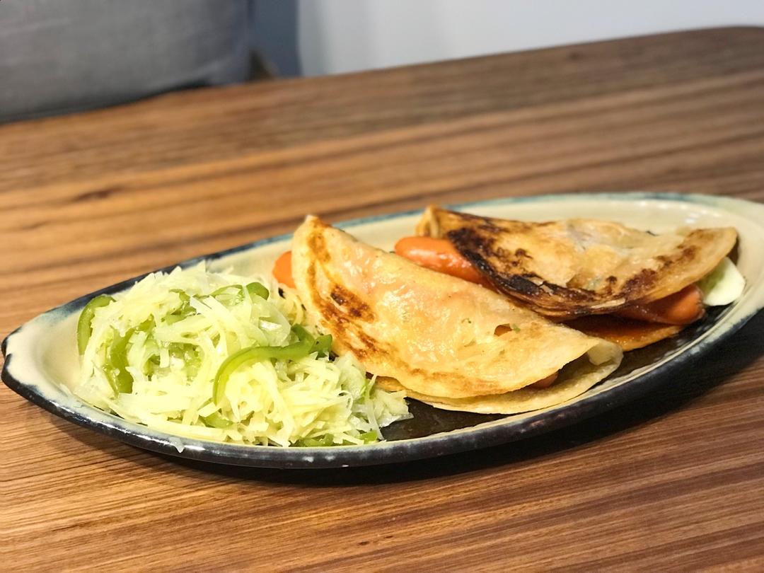 七月的第一顿早午餐 葱油饼包香肠和土豆丝 涂点番茄酱 就很美味了