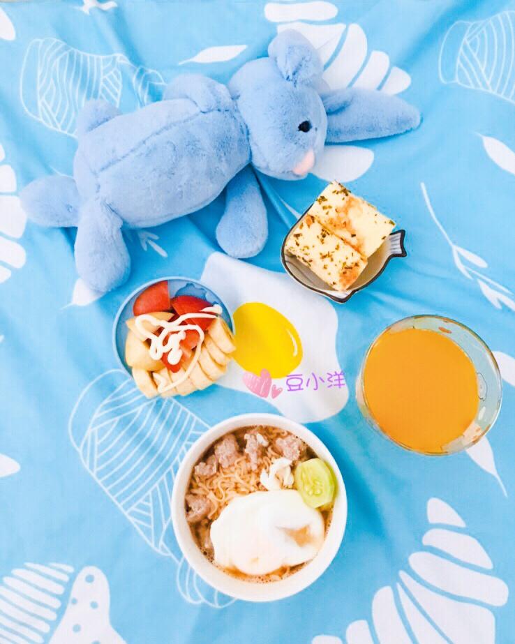 荷包蛋肉丸鸡汤面+肉松蛋卷+🍌🍑沙拉+橙汁
