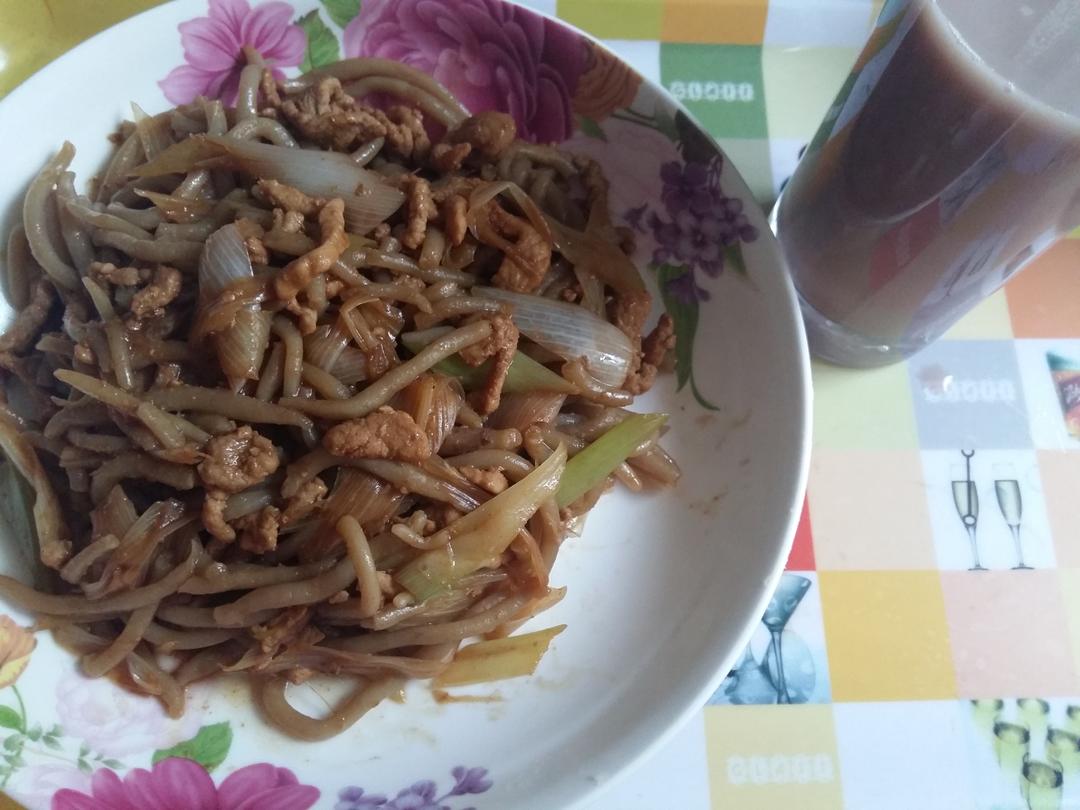 莜面条,和大葱肉丝一起炒。再加一杯红豆豆浆。话说,搓莜面条是莜面各种吃法中最费劲的,然而也是最好吃的。