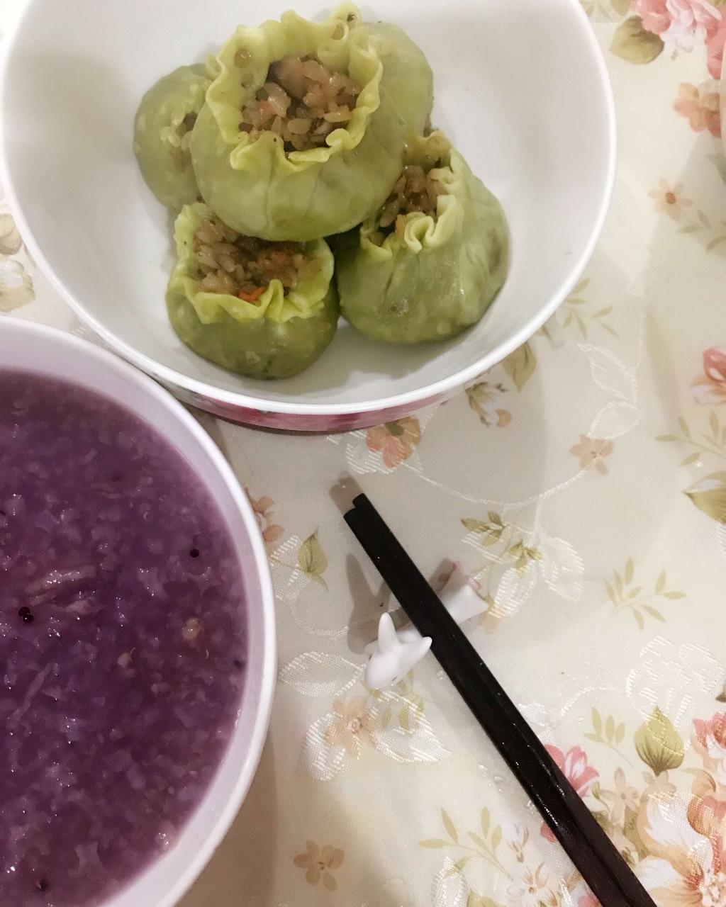 自制香菇猪肉烧麦+黑米粥