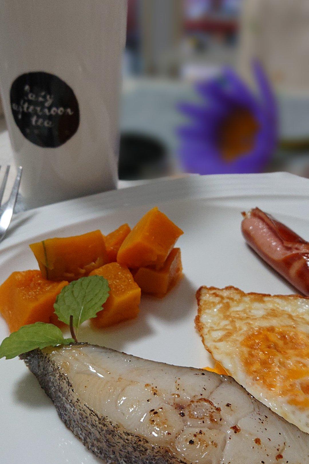 一份鳕鱼,一份香肠,一份蒸南瓜,一份煎蛋,薄荷水。