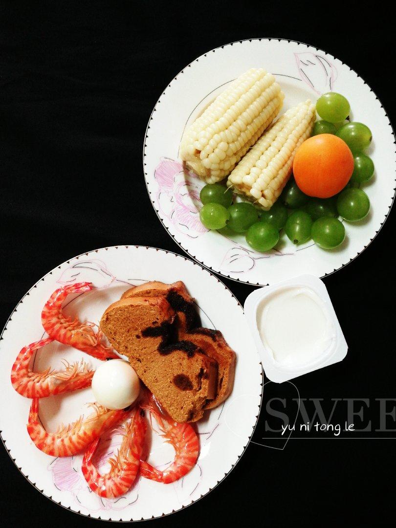 红糖馒头、鸡蛋、虾、酸奶、玉米、青提、杏子
