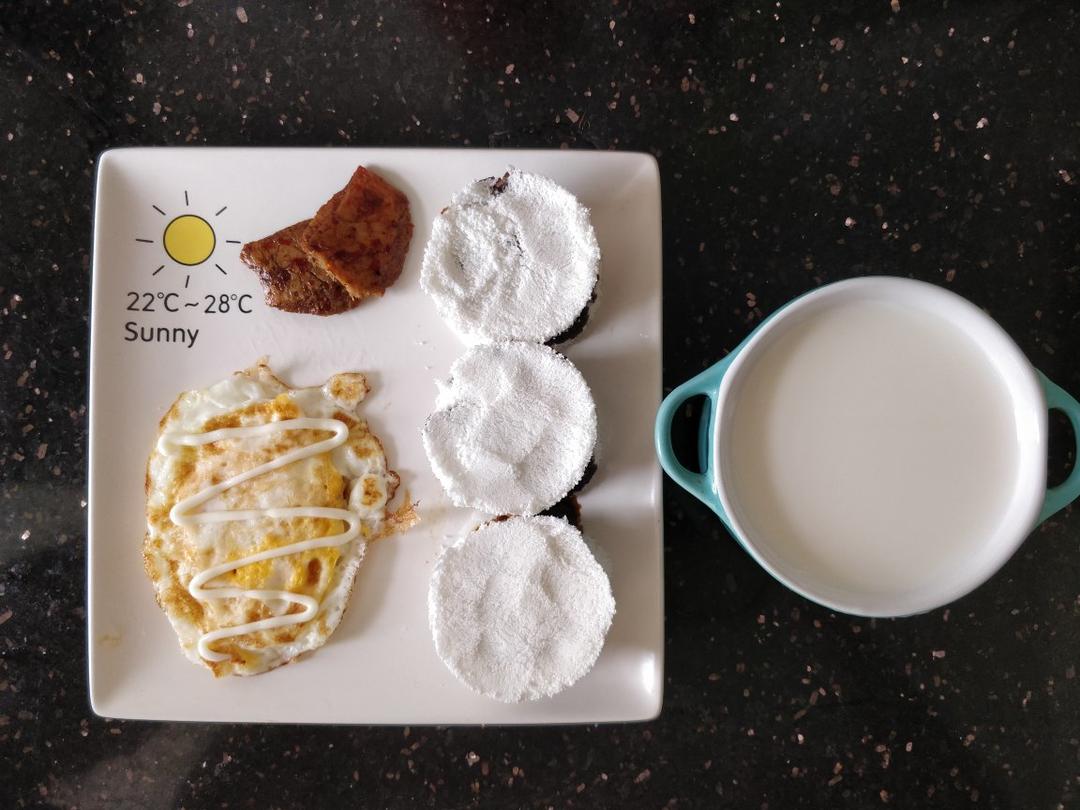 今日早餐:雪蒸糕,煎蛋,蛋白素肉,牛奶。🍽