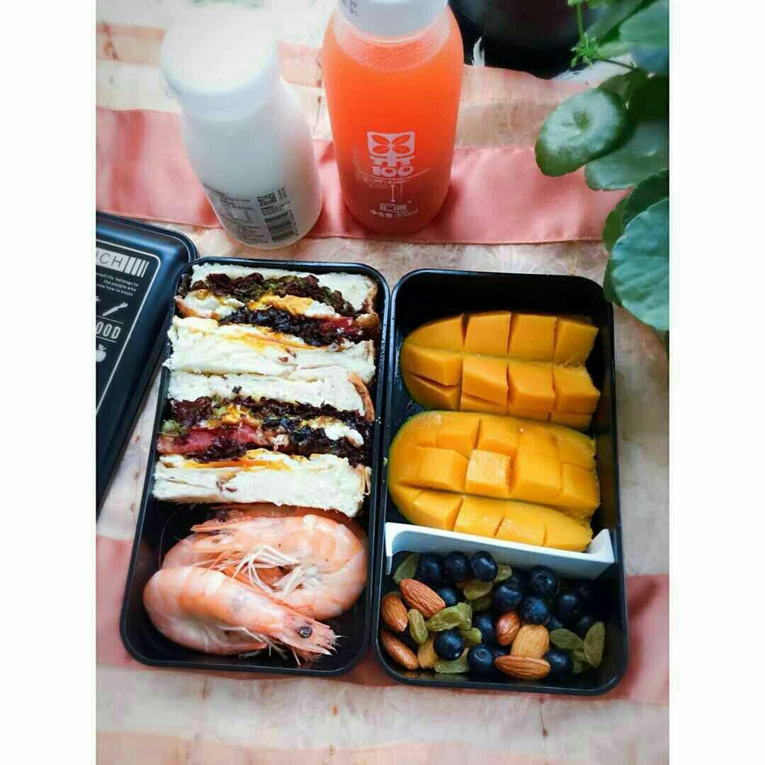 咖啡屋_gdv5 做过 第二届早餐马拉松 #早餐•2018年7月6日#今天是星期五啦!马拉松早餐打卡第十二天,儿子的早餐便当🍱:土司三明治(鸡蛋西红柿红叶生菜)+厄瓜多尔红虾+芒果+坚果杏仁葡萄干蓝莓+一瓶酸奶+一瓶胡萝卜汁 2018-07-06