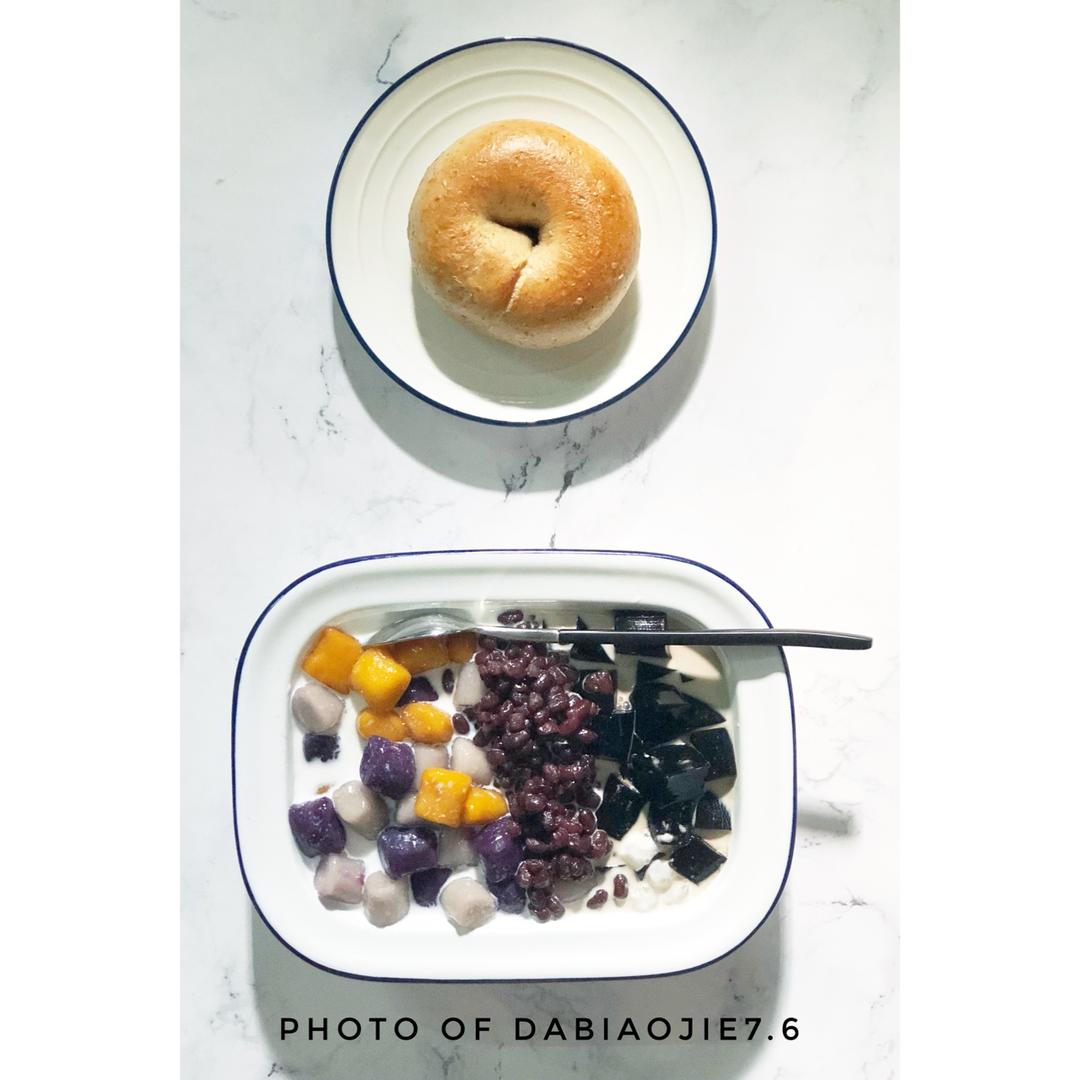 彩色多米鱼 做过 第二届早餐马拉松 Day12早餐马拉松跑过半程了,今天第12天,今天早上吃芋圆蜜豆烧仙草➕全麦贝果,蜜豆和烧仙草昨天晚上提前准备好,早上起来煮西米和芋圆,加上椰浆牛奶和炼奶,就是这么简单好吃[呲牙] #早餐•2018年7月6日##早餐马拉松打卡# 2018-07-06