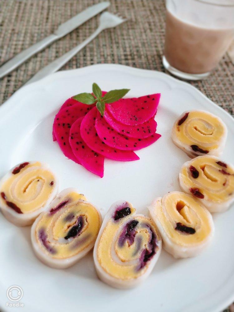 最近迷上了坚果奶,比动物奶更有营养!冰皮蓝莓蛋糕+火龙果+可可坚果奶!简简单单,健康美味!✌✌✌