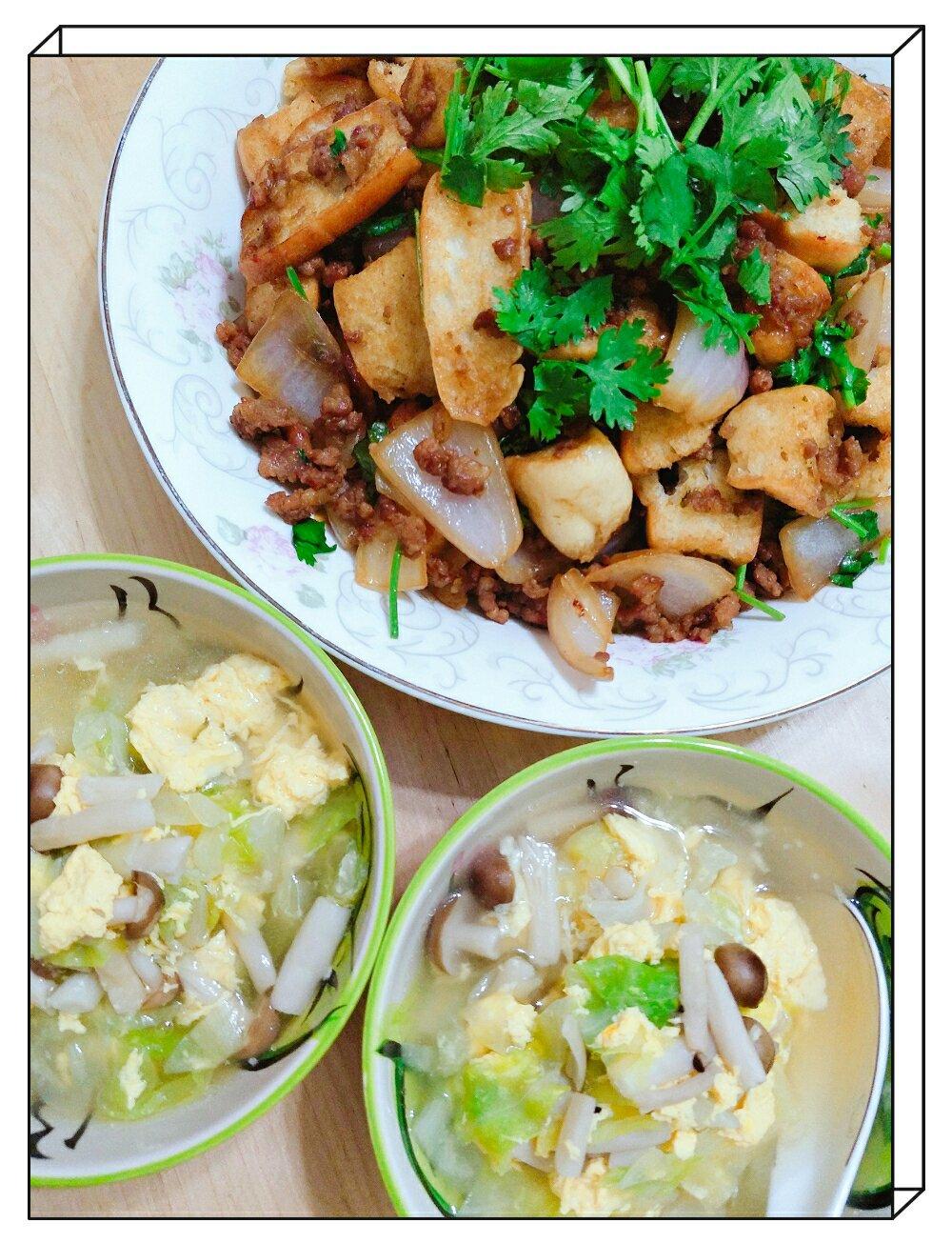 肉末炒饼+蔬菜蛋汤