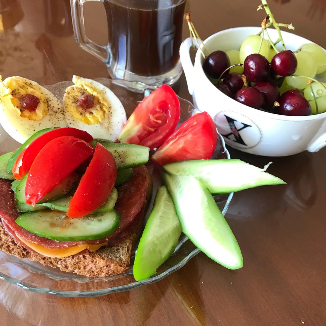 火腿红奶酪辣番茄酱全麦三明治,黄瓜,番茄,水煮蛋,樱桃,青提,黑咖~ 上午绿茶~