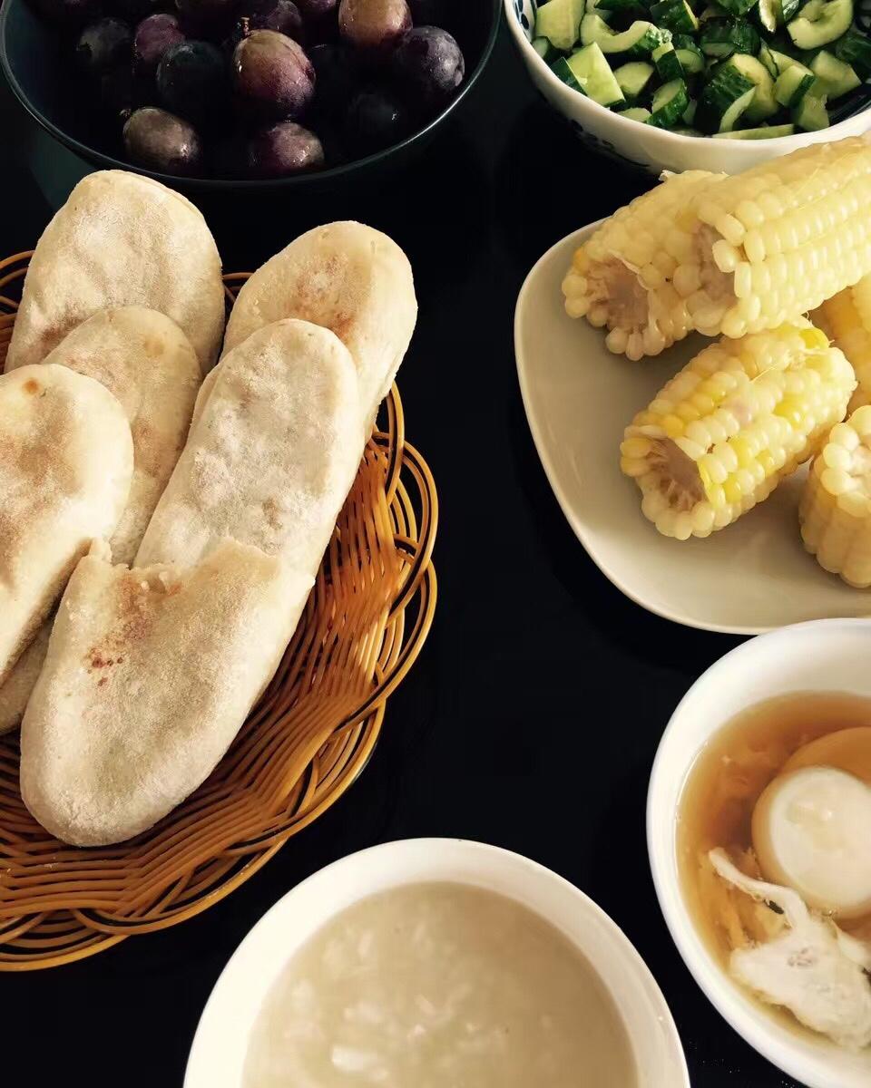 Day 15: 早安!老肥发酵,做全麦牛舌饼,兼顾各人口味,有椒盐的、白糖的、原味的。喝大麦彩子粥,啃玉米。