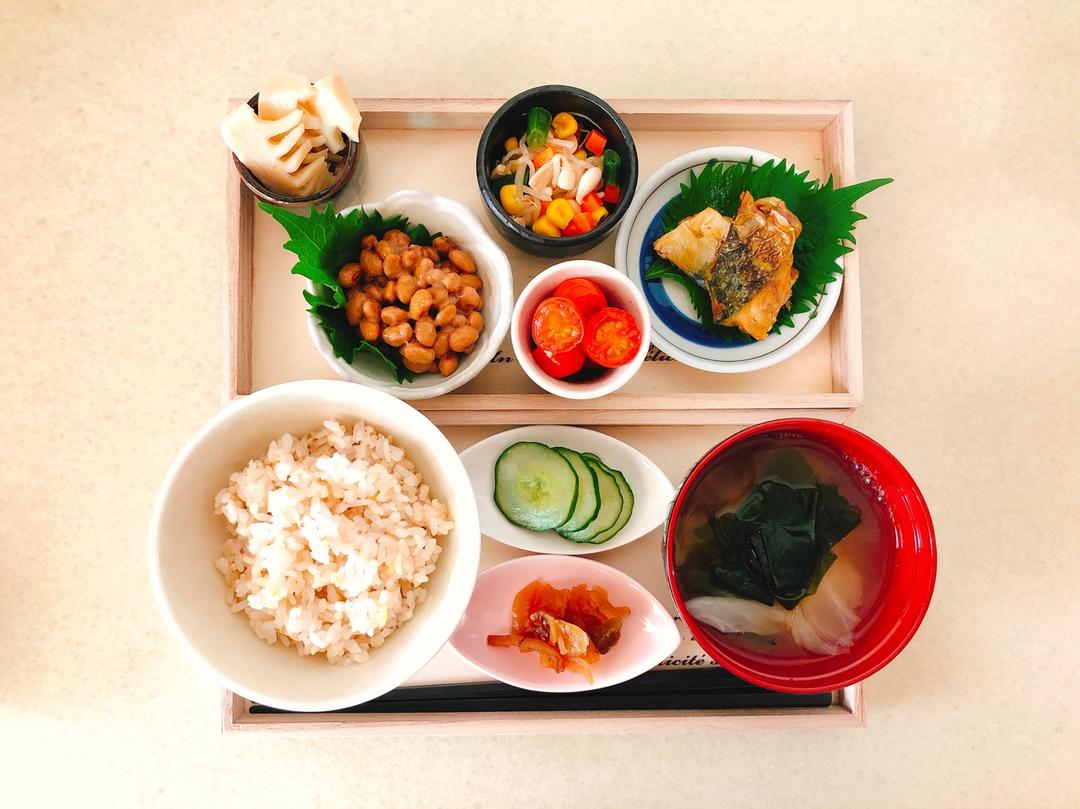 ctlin 做过 晚餐•2018年7月9日 我的和風定食!納豆,煎鯖魚(姜汁醬醃漬),油醋小番茄🍅,黃豆芽拌雜蔬,柴魚高湯泡竹筍,醋漬青瓜,福神漬,雜糧米飯,包菜海帶芽味噌湯。 #晚餐•2018年7月9日##日本料理# 2018-07-09