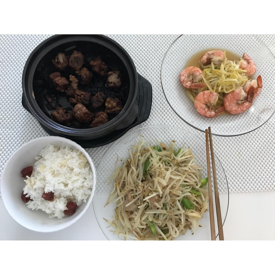 梅干菜排骨 腊肠蒸米饭 青椒豆芽 韭黄炒虾仁