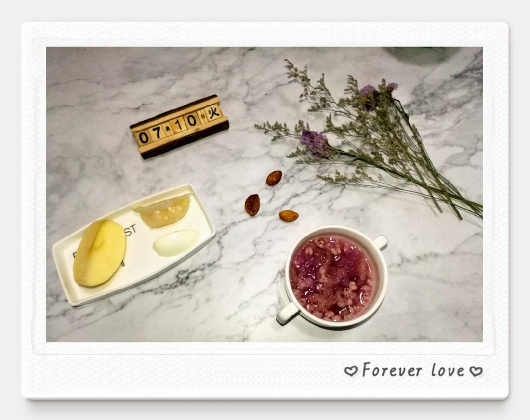 紫薯银耳薏米羹+虾饺+煮鸡蛋+苹果+坚果
