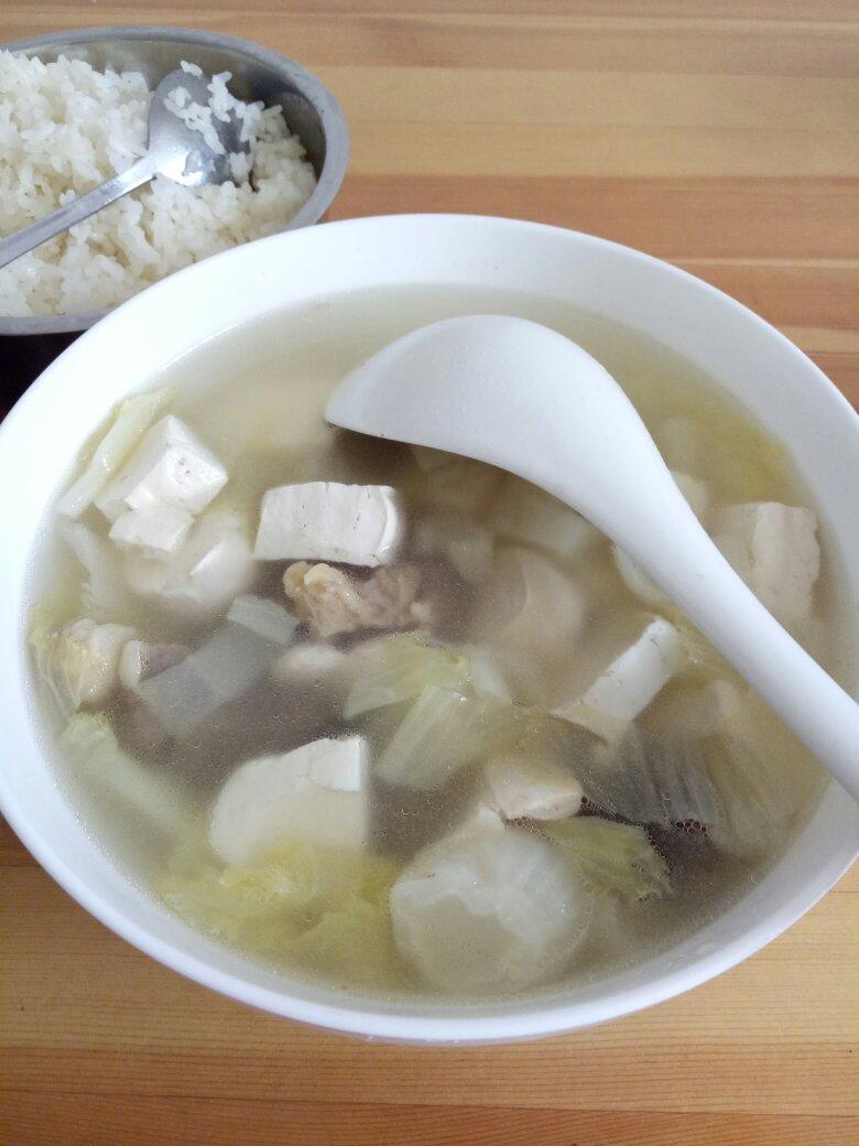 米饭要用果醋和橄榄油拌匀,这样才好吃,嘿嘿嘿。牛肉豆腐汤,鲜得嘞~