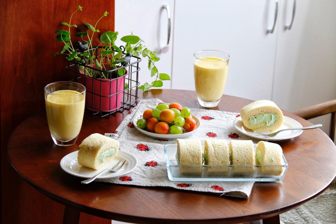 玉米汁+抹茶蛋卷+水果