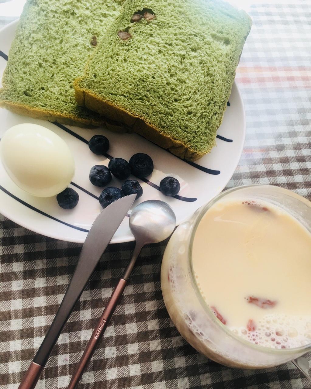 抹茶红豆土司+鸡蛋+蓝莓+芝麻豆浆