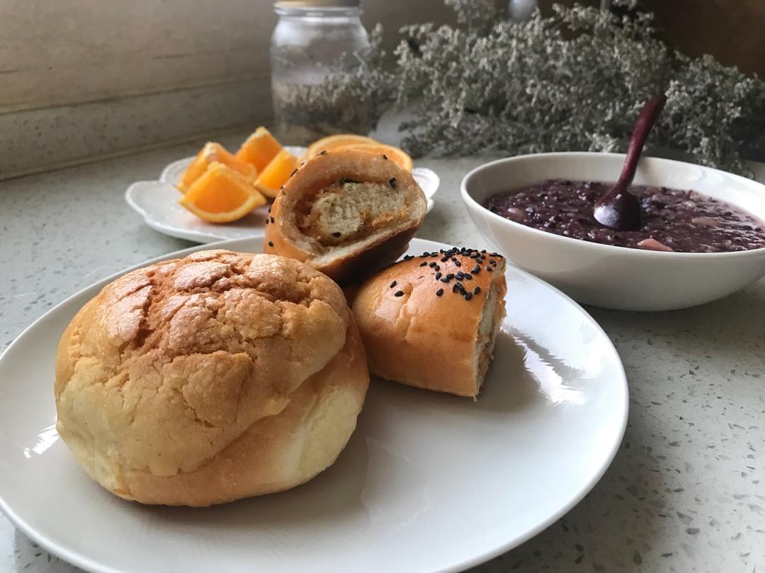 今天黑米粥配菠萝包