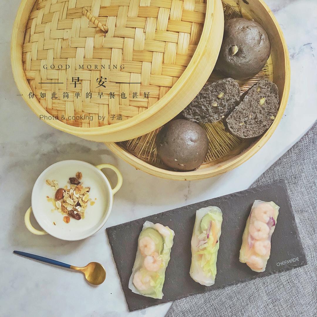 兔酱的厨房 做过 2018年07月17日 你吃不吃早餐,高温该来还是来反正都要热炸,先吃饱再炸🤨今日份早餐~大虾越南春卷,麻麻黑栗子芝麻馒头,燕麦坚果酸奶 #早餐•2018年7月17日# 2018-07-17