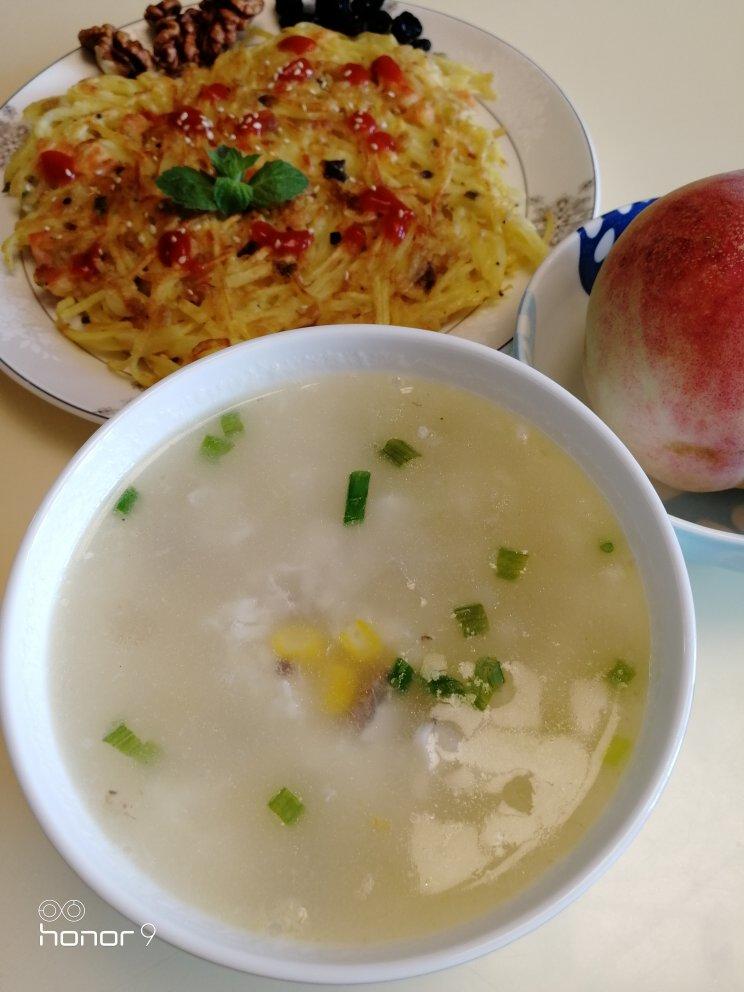 早餐马拉松打卡D17 三文鱼🐠 虾皮土豆鸡蛋饼🍳 玉米鱼蓉蛋清冬瓜羹