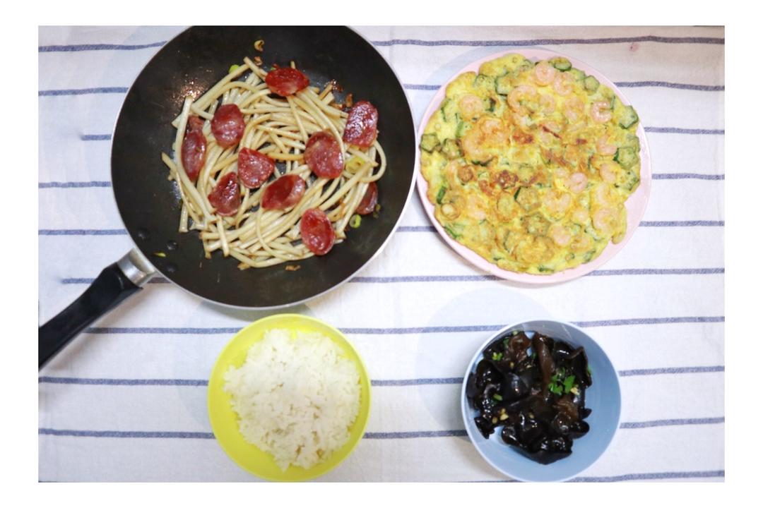 腊肠花生芽+秋葵煎蛋+凉拌木耳