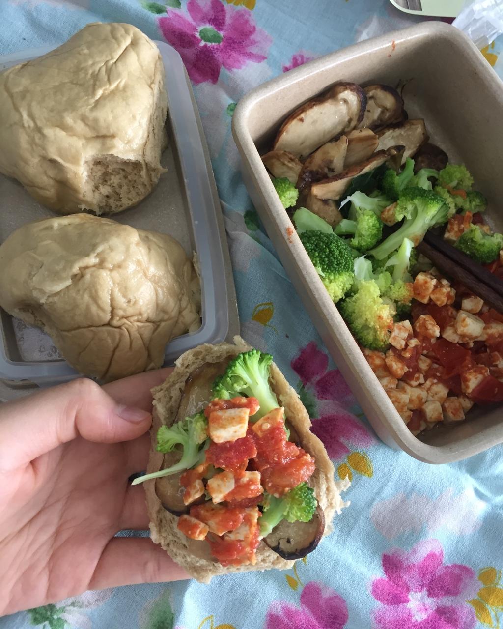 自制红糖馒头 煎香格里拉松茸 番茄豆腐丁 水煮西蓝花 中式汉堡 好好吃