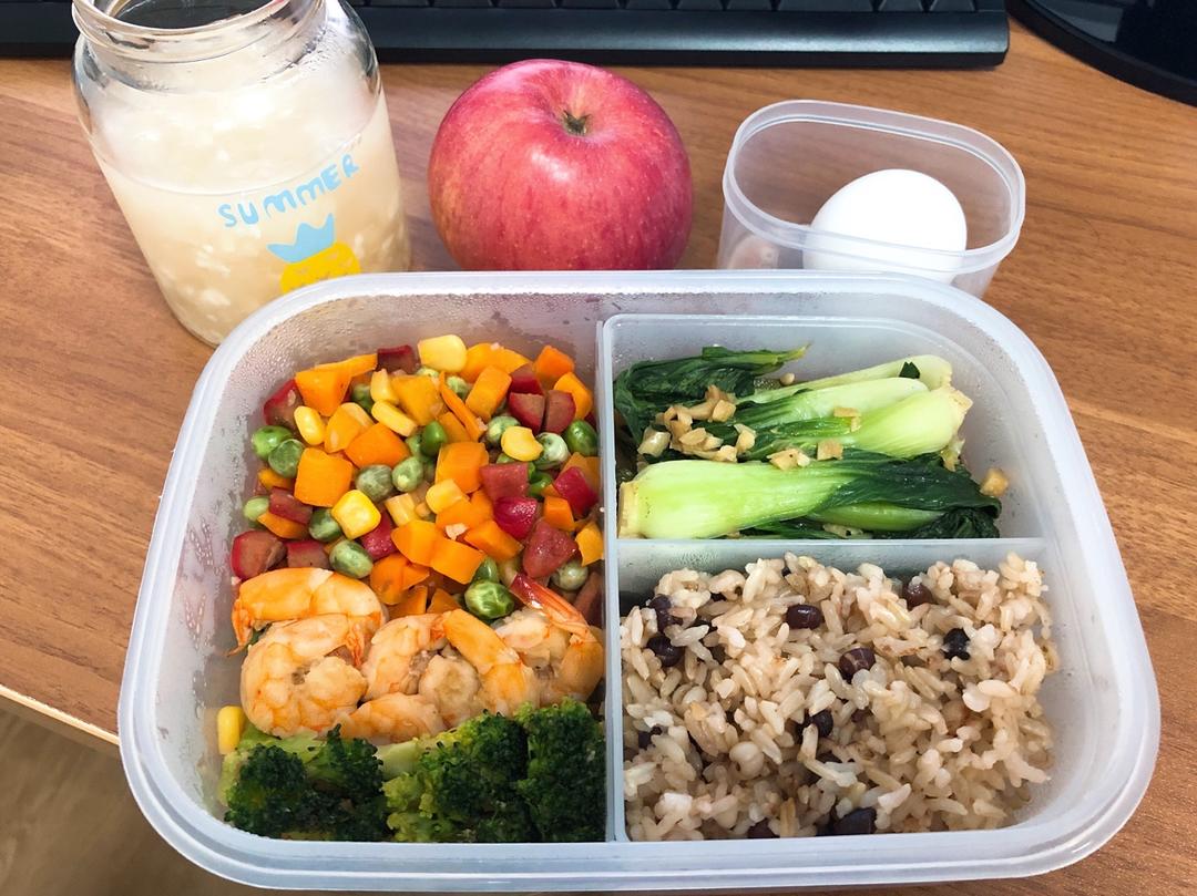红豆薏仁杂粮饭+炒上海青+广式腊肠炒杂蔬丁+蚝油西兰花虾仁
