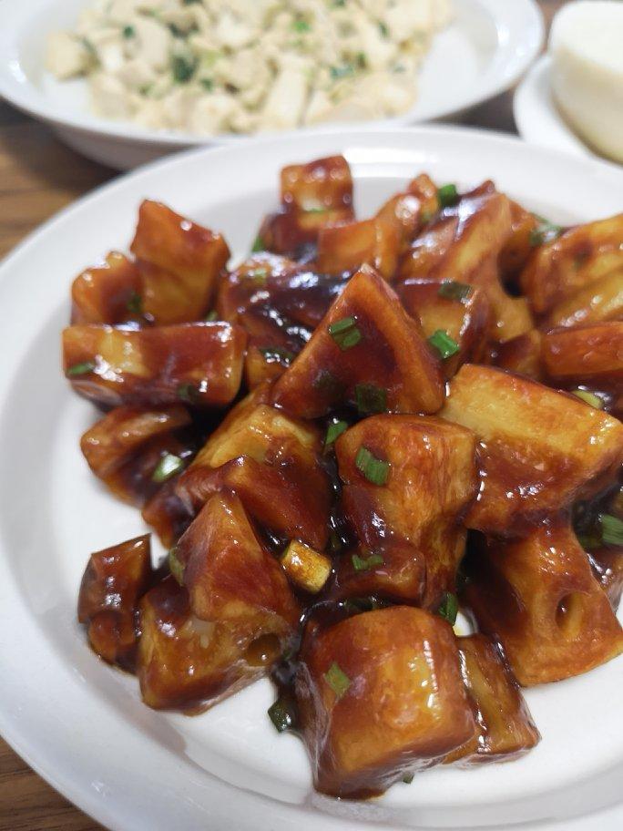 糖醋藕块、葱炒豆腐,自己做的馒头。配了抹茶牛奶