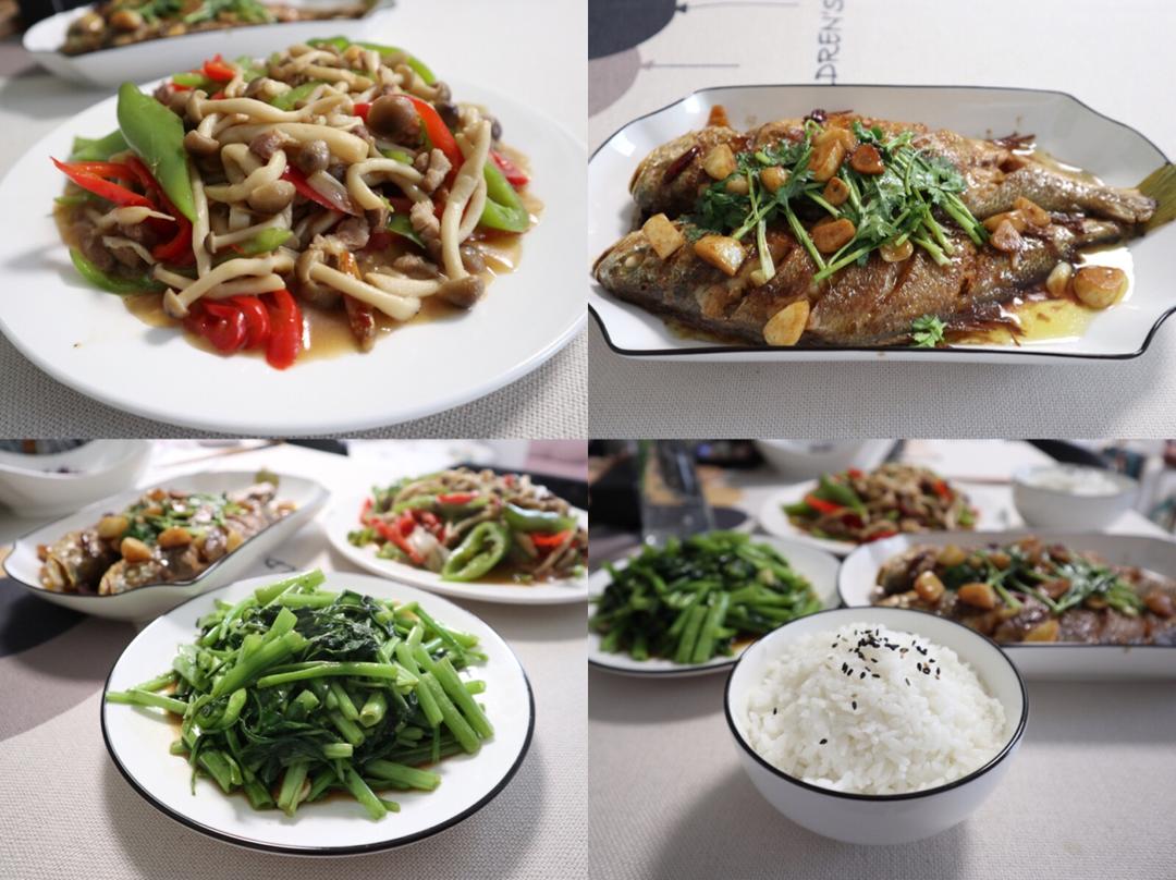 红烧黄花鱼➕ 海鲜菇炒肉➕白灼菜心➕东北大米饭